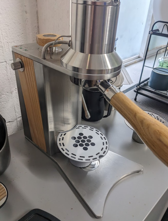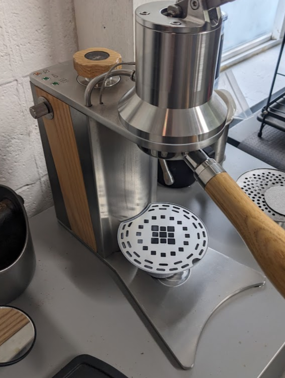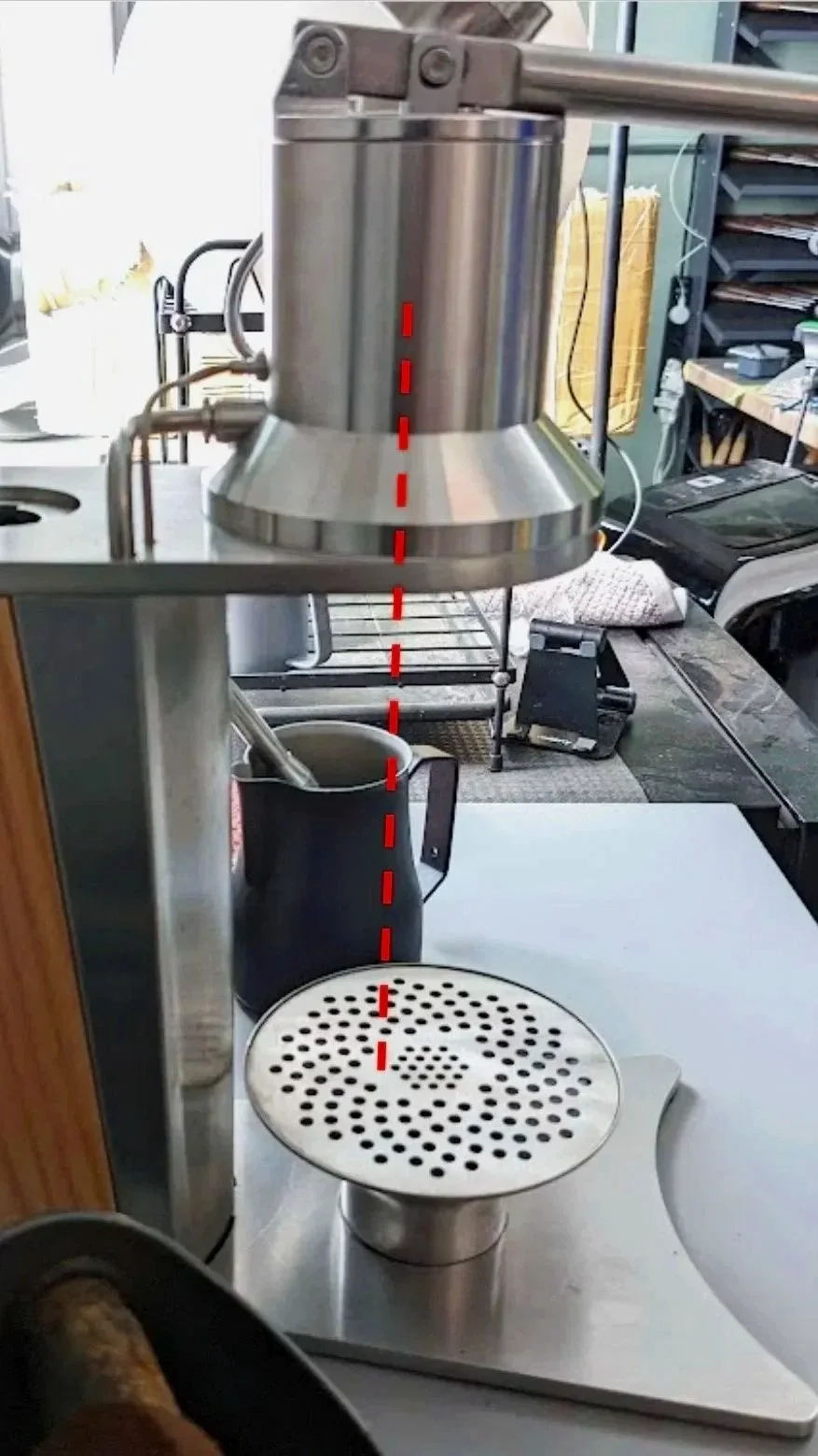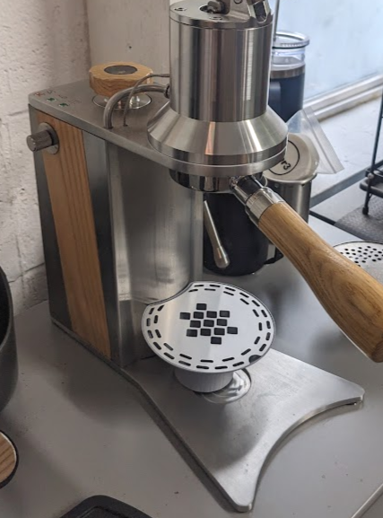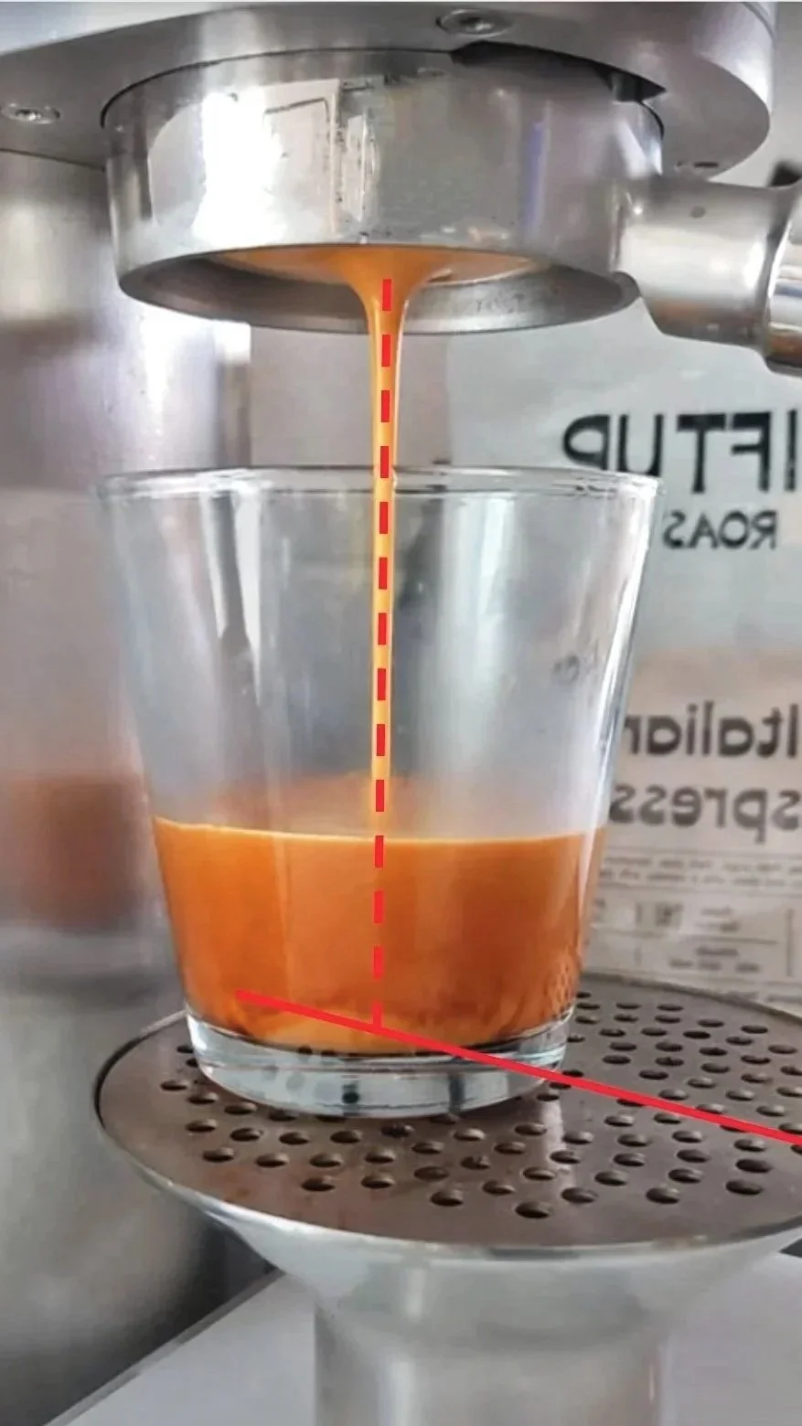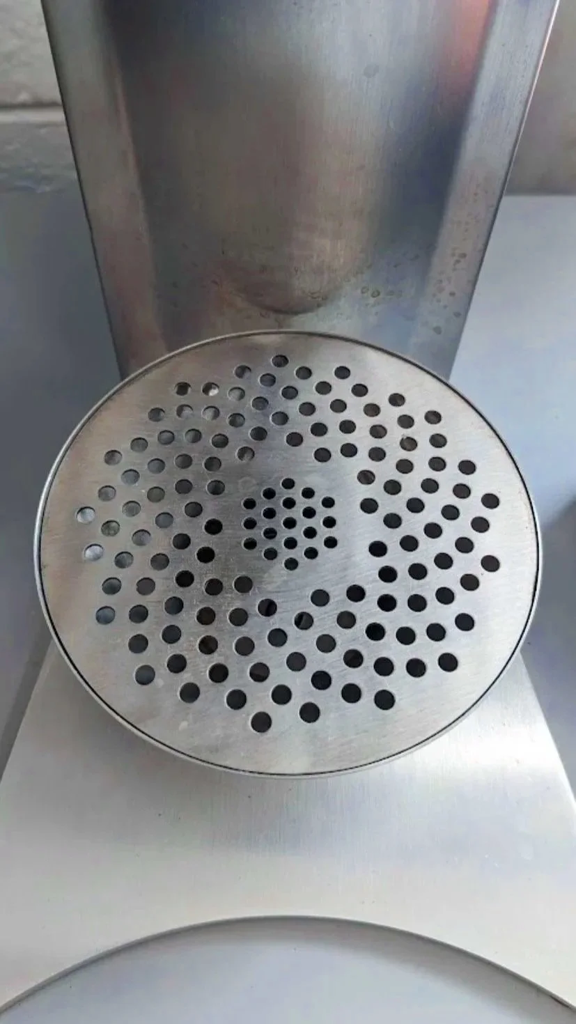 The misalignment of the drip tray and the pattern of the grate caused splatter during machine purging. Shot placement was also visually and functionally off-center.